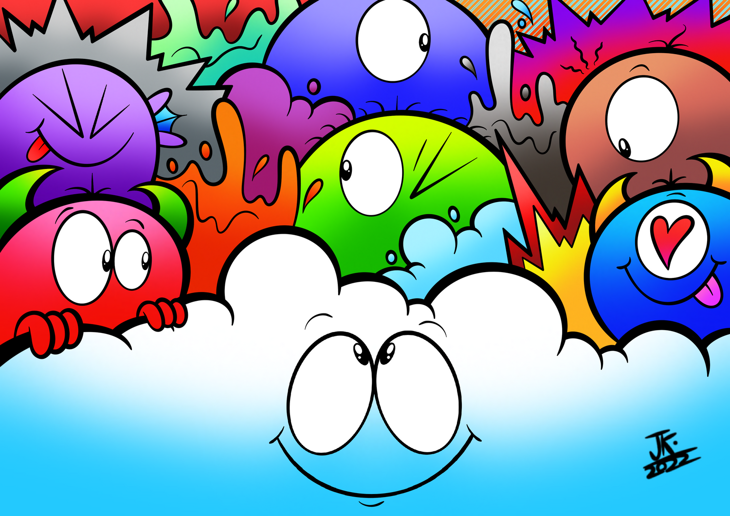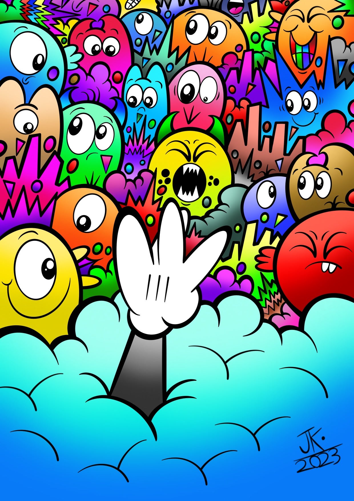 The JK Cartoon Studios (JKCS) founded by JK is a well-being community-company. The JKCS has been producing workshops, events, live performances and experiences for groups since the summer of 2021 –featuring JK’sart which forms the basis for various interactive experiences (including colouring sheets and activities).